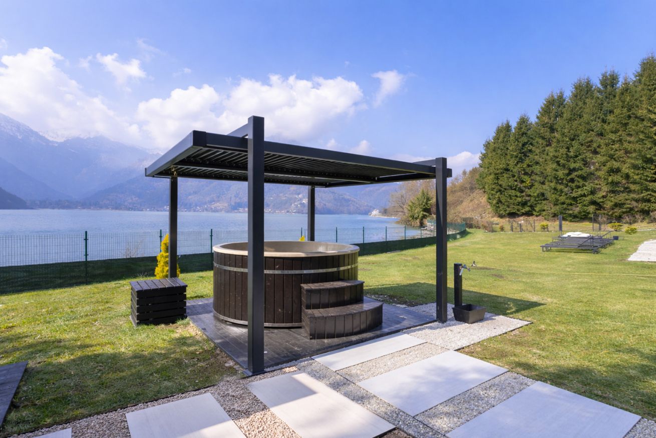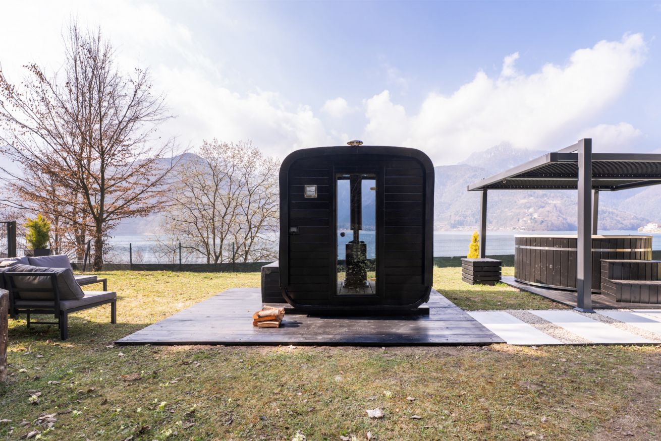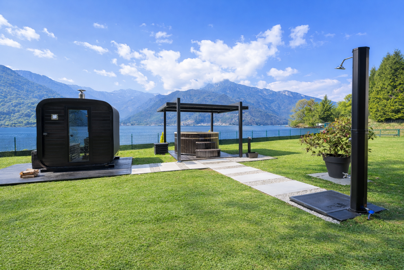 L’area wellness privata è pensata per regalare momenti di puro benessere: la sauna panoramica in legno crea un ambiente caldo e rigenerante, mentre la vasca idromassaggio esterna permette di rilassarsi ammirando il lago e le montagne circostanti. A disposizione degli ospiti è stata installata nel 2025 anche una cucina esterna, ideale per cucinare e gustare i pasti all’aperto, con la possibilità di pranzare o cenare direttamente affacciati sul lago.