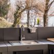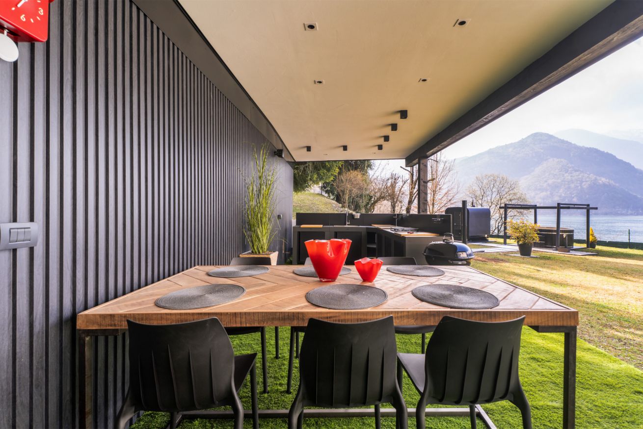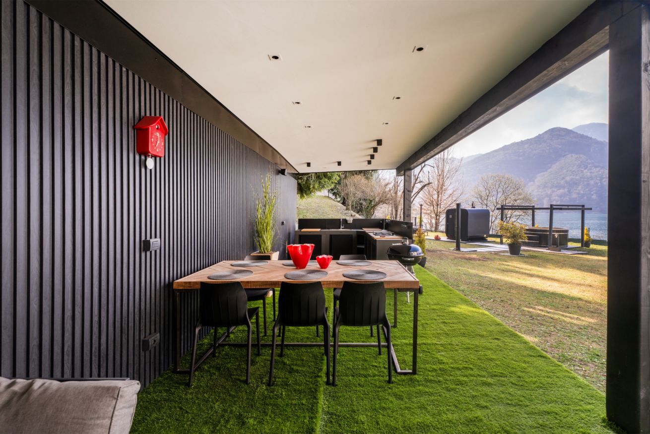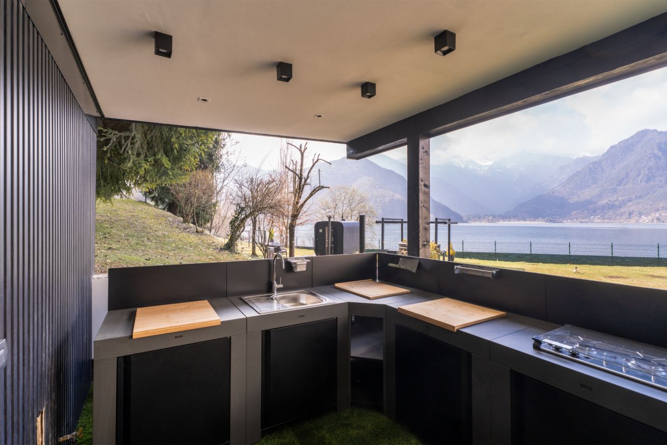 L’area wellness privata è pensata per regalare momenti di puro benessere: la sauna panoramica in legno crea un ambiente caldo e rigenerante, mentre la vasca idromassaggio esterna permette di rilassarsi ammirando il lago e le montagne circostanti. A disposizione degli ospiti è stata installata nel 2025 anche una cucina esterna, ideale per cucinare e gustare i pasti all’aperto, con la possibilità di pranzare o cenare direttamente affacciati sul lago.